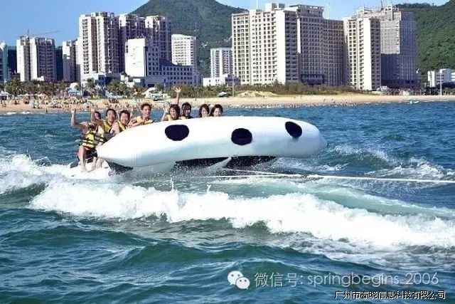 坐在飞驰的香蕉船上很刺激,海浪扑打着脸蛋,几乎要把整只船掀翻,这是一项发挥团队精神的游戏,大家根据自己的体重形态安排每个人的位置,充分发挥集体潜能。大家时不时回头看看自己的“船”友是否有被海浪击倒,你我牵挂着!