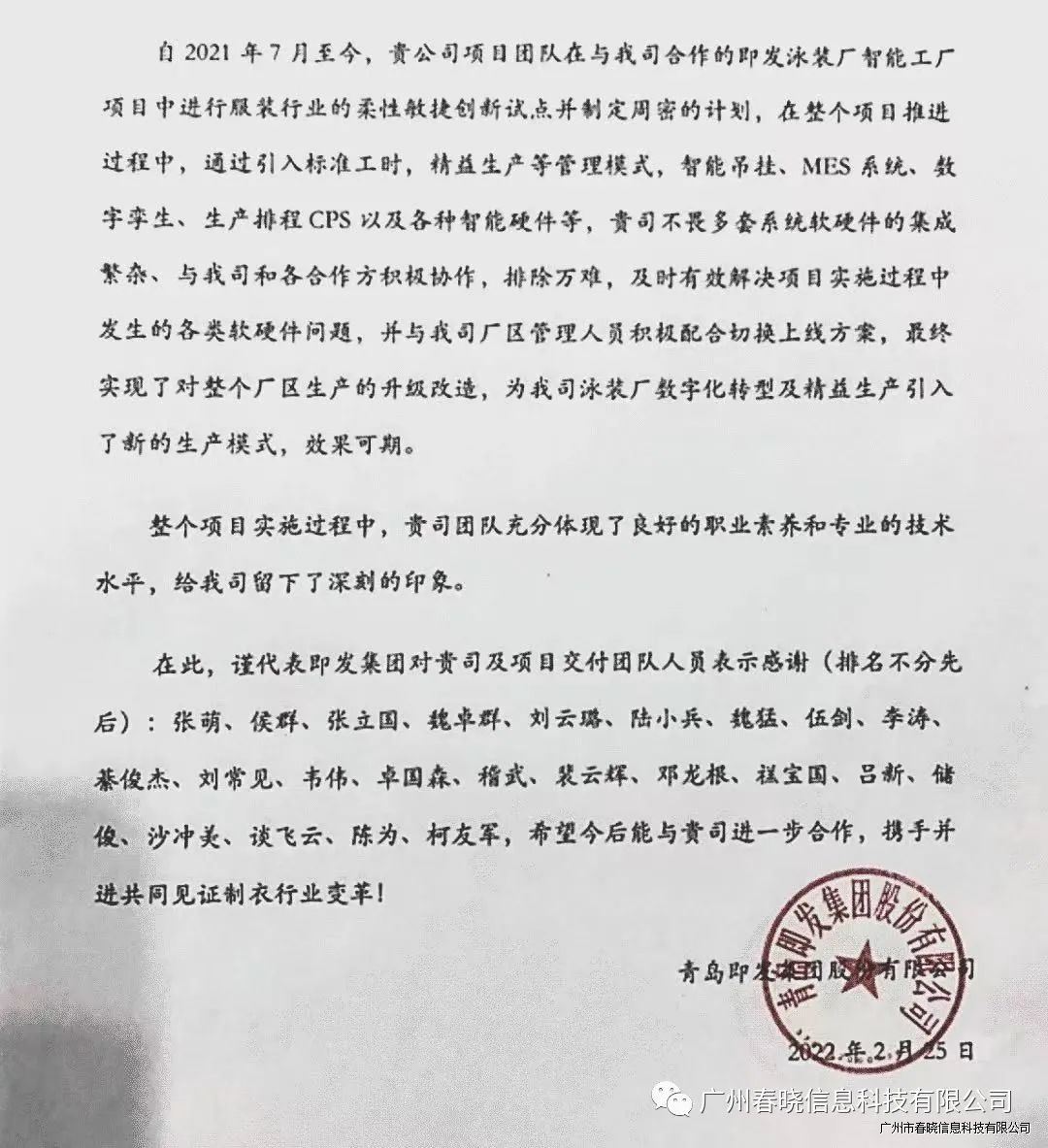 近日,我司收到青岛即发集团股份有限公司发来的感谢信。信中,即发集团对在“即发泳装厂智能工厂项目中”表示高度认可。并对我司此次参与项目的谈飞云、陈为、柯友军等项目团队半年多以来的付出与全力配合表示衷心的感谢。